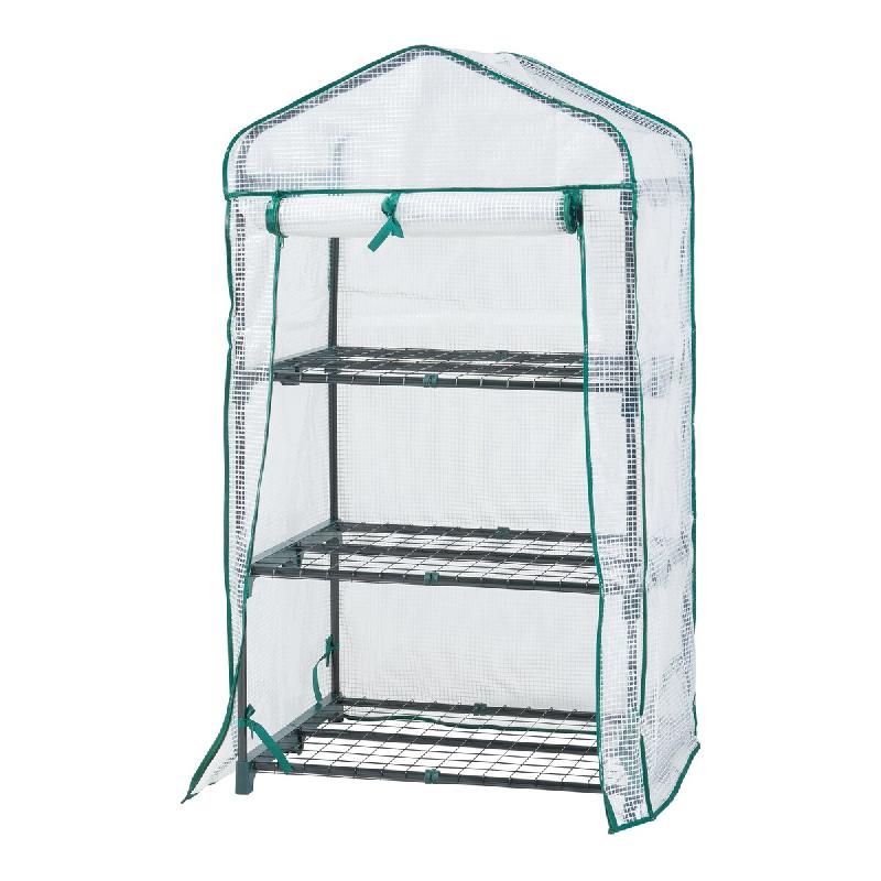 Serre de jardinCette serre de jardin polyvalent peut être monté facilement grâce au système d'emboîtement en peu de temps. Les trois étagères en treillis offrent de la place pour vos plantes, semis de légumes et herbes aromatiques.Elle est un abri optimal contre la pluie, le rayonnement solaire intense et les visiteurs indésirables du monde animal, peu importe ou vous installez votre coin vert : dans le jardin, sur la terrasse, dans la cour ou sur le balcon.Le toit à deux pentes permet à l'eau de pluie de s'ecoule et évite l'accumulation et la stagnation de l'eau. La couverture en polyéthylène laisse passe la lumière mais absorbe les rayons UV nocifs.La porte enroulable à fermeture éclair facilite l'arrosage et la fertilisation des plantes. Elle assure l'aération et le réglage de température intérieure contrôlés favorisant le bon entretien des plantes.Description :- serre de jardin avec porte enroulable
