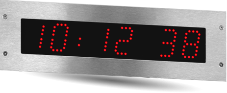 Horloge chronomètre pour salle d'opération hôpital à LED rouges - Caractéristiques : - Affichage heure minute seconde, chiffres 5 cm - Boîtier INOX brossé encastrable - Mode chronomètre avec pupitre à encastrer - Horloge synchronisée par NTP - Alimentation PoE -
