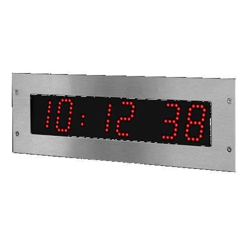 Horloge chronomètre hôpital à LED rouges - Affichage heure - minute 7 cm et seconde 5 cm - Boîtier INOX brossé encastrable - Façade étanche - Fonctionne en mode chronomètre avec pupitre à encastrer - Horloge autonome à quartz - Alimentation 230V -