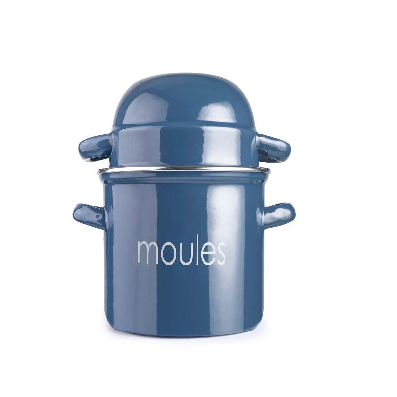 Récipient émaillé conçu pour cuire des moules à la vapeur et les présenter directement à table avec un style traditionnel et attrayant. Son corps de couleur turquoise et son couvercle assorti — qui peut également être utilisé pour déposer les coquilles — offrent une présentation prat