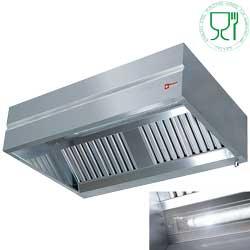 Réalisation en acier Inox 18/10 AISI 304 - Faces non visibles en acier inox AISI 430 - Joues latérales soudées par point - 12 filtres inox à labyrinthes - Goulotte périphérique soudée pour la récupération des graisses - Robinet d'évacuation inférieur - Éclairage encastré avec néo