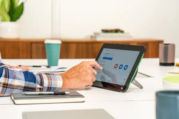 L€écran de commande tactile Poly TC10 rend les réunions plus productives et permet aux utilisateurs de planifier facilement des espaces de travail et des salles de conférence.