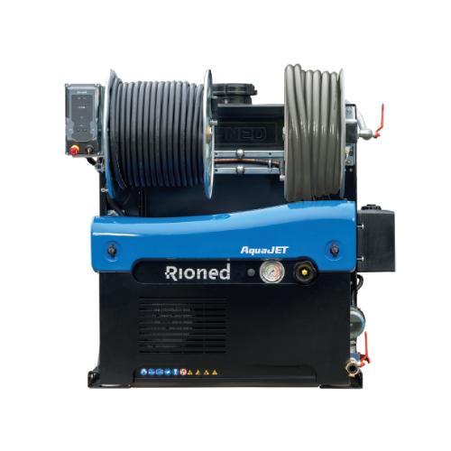 Les enrouleurs en acier et le grand tableau de commande sont fixés à hauteur ergonomique et donnent une maniabilité optimale. Le maniement complet de l'AquaJet se fait à portée de main à l'arrière de la machine. L'AquaJet est livrable dans différentes capacités et peut être équipé d'un moteur à essence ou diesel. Plusieurs options sont disponibles comme : la télécommande RioMote.
