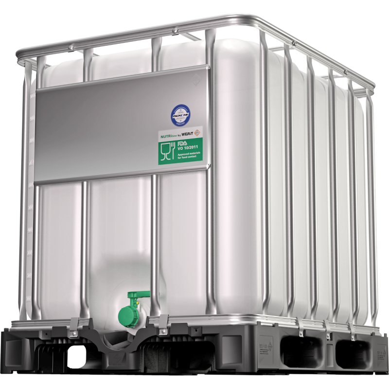 Grand Récipient pour Vrac (GRV) de 800 L avec palette et cage en acier renforcée par des cornières d'angle en plastique. Poche graduée en PEHD vierge stabilisé UV de qualité alimentaire, dont les composants sont produits en salle blanche sous atmosphère maîtrisée à partir de matières premières vierges. La vanne de vidange et le couvercle sont sécurisés par des scellés.Cet IBC a spécialement été développé pour répondre aux besoins de l'industrie alimentaire, Il est conforme aux exigences FDA/EN 10/2011, Halal et Casher et fabriqué selon les normes BRC, FSSC 22000 et HACCP.Les risques de dépôts sont limités grâce aux barreaux verticaux du cadre. Le stockage et le transport sont sécurisés par la fourniture d'une housse plastique en film étirable pour la protection contre la contamination. Il est monté sur une palette 3 semelles en polyéthylène renforcée par une traverse en métal de format 1200 x 1000 mm pour garantir sa stabilité et faciliter son transport.Idéal pour stocker et transporter des liquides ou solides : Non dangereux non soumis à des règlementations particulières De différentes densités, maximum jusqu'à 1,6 kg/dm3 A courte ou longue durée de conservation Dont la température est comprise entre -20°C et 40°CPratique : Adapté au transport par chariot élévateur à fourches ou transpalette Simple à remplir par l'ouverture sur le dessus équipée d'un couvercle Rapide et facile à vider par la valve de sortie refermable, avec une très bonne vidange résiduelle Simple à démonter Facile à nettoyerEconomique : Gain de temps quant au processus de charge Gain de place car empilable Aucun équipement supplémentaire requis Aucun emballage de sécurisation supplémentaire requis : pas de filmage, ni de cerclage, ou protection des coins Usage multiple : reconditionnement possibleSûr : Manutention facile (chariot élévateur, transpalette) Divers certificats possibles Arrimage simple du chargement Cage équipée de barreaux verticaux d'une épaisseur de 30 mmIBC non homologué UN, disponible sur demande en homologation UN.Consultez nous pour toutes les demandes de sur mesure, d'options ou d'accessoires complémentaires tels que : Couvercle Kit vanne Bec de vidange Bouchon de vanne Adaptateur Scellé plastique Housse de protection Inliner
