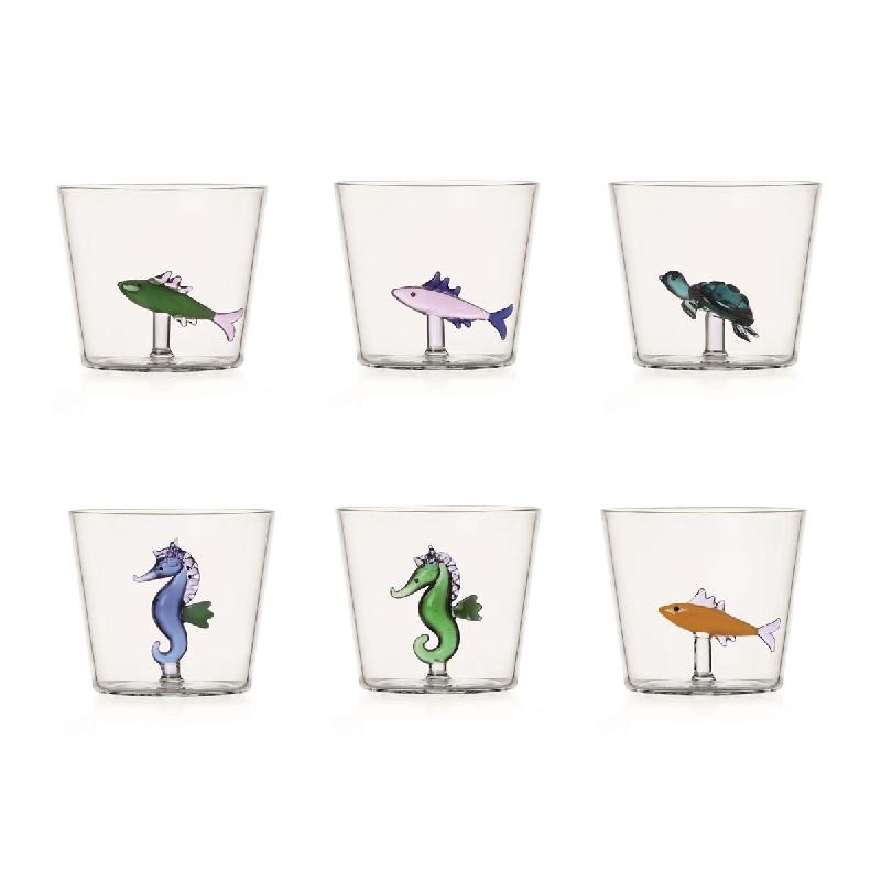 Ichendorf - Ensemble de 6 verres Acqua - Nouveau Jardin MarinLe Jeu de 6 verres Acqua New Marine Garden, conçu par Alessandra Baldereschi, enrichit la table de motifs marins alliant poésie et savoir-faire. Chaque verre, fabriqué en borosilicate moulé à la lampe, représente des créatures aquatiques telles que des tortues, des hippocampes et des sardines dans des combinaisons de couleurs vibrantes.