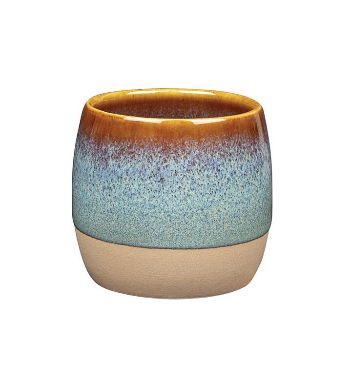 Tasse en Grès décorée avec un émail réactif ; Coloris Azur cuivré très élégant et très agréable au touché. Peut également être utilisé comme petit contenant ou mise en bouche. Le décor peut varier d'un gobelet à l'autre.