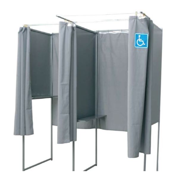 Isoloir Electoral standard de "départ"Dimensions : largeur 800 mm x 800 mm Structure en acier 20 mm x 20 mm Coloris : laqué marron et panneaux latéraux en tôle laquée beige Rideaux en coton écru opaque classement au feu M1 "non inflammables" Montage et démontage simple et rapide Possibili
