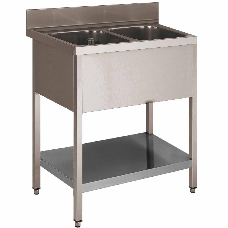 Plateau avec 3 bords anti-ruissellement pré-percé ø 32 mm Dosseret arrière de 100x20 mm en inox AISI 304 Piétement inox AISI 304 Bacs avec angles rayonnés, égouttoir nervuré Piétement en tube carré 40x40 mm Piétement décalé de 65 mm avec vérins inox réglables et jupe d'habillage 3 faces Livrée avec tube surverse, bonde et siphon plastique Livrée montée soudée Étagère basse pleine H-200 mm