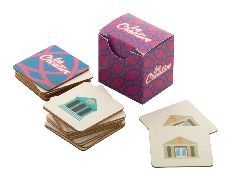 Jeu de mémoire en carton avec motifs thématiques dans sa boîte en papier personnalisée. - Avec 24 tuiles (40x40 mm). - Le prix comprend l'impression au dos de toutes les fiches et la boîte imprimée en quadri. - Quantité minimale : 100 pièces. - Caractéristiques : - Couleur : naturelle