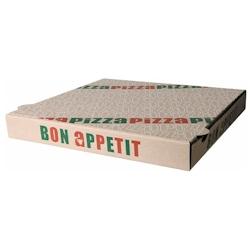 Boîte à pizza carrée 33 x 33 x 4 cm en carton ondulé 115g, température : - 5°C à +100°C couleur kraft imprimé vert et rouge, poids : 122g, carton de 100 U, contact alimentaire, vendu au carton - Marque : KALIPTIS - Prix de livraison : 11.99 € - Délai de livraison : 2 - 3 jours ouvré