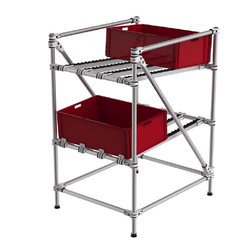 Flowrack Kanban à angle en façade pour boites, cartons et KLT. Niveau retour vides en postion haute. Structure Aluminium. Charge 150 kg par niveaux . Niveaux réglable en hauteur et inclinaison. 1+1 niveaux . Rails à à galets rivetés. Montage sur pieds réglables au sol. - Référence : 58 - 1