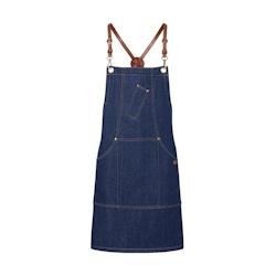 Tablier bavette DENIM, bretelles en cuir détachement facile à l'aide des mousquetons, reglables à l'aide de boucles, rivets couleur bronze et coutures contrastées, poche stylo, 2 poches latérales 16x20 cm, 333g/m2, 100% COTON