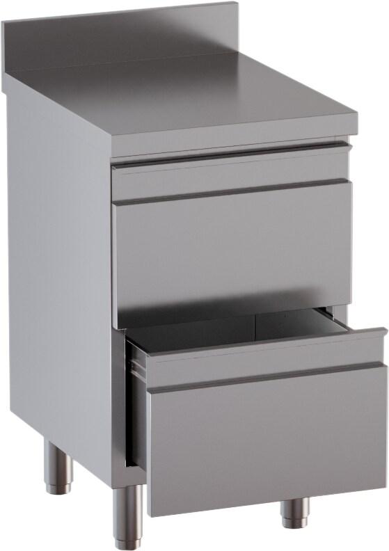 Armoire à tiroirs avec plan de travail et rebord de 100 mm entièrement fabriquée en acier au nickel - chrome CNS 18/10 (AISI 304). Dépassement du plan de travail de 6 mm sur les côtés, 8 mm à l'avant et à l'arrière et rebord de 40 mm. La surface du plan de travail est hydrofuge pour une hyg