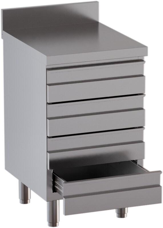Armoire à tiroirs avec plan de travail entièrement fabriqué en acier au nickel - chrome CNS 18/10 (AISI 304). Dépassement du plan de travail de 6 mm sur les côtés, 8 mm à l'avant et à l'arrière et rebord de 40 mm. La surface du plan de travail est hydrofuge pour une hygiène optimale. En ou