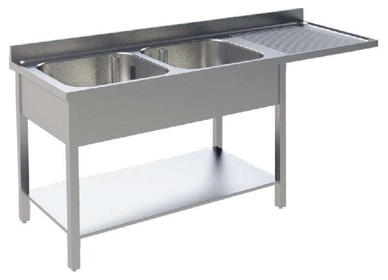 Bacs de plonge et égouttoir en inox (AISI304) - Piètement en inox (AISI201) - Égouttoir à droite - 2 bacs de plonge - Plonge insonorisée avec bords anti - ruissellement - Égoutoir nervuré - Dosseret plat (100 x 20 mm) - Pieds carrés avec vérins ajustables sur 30 mm - Bonde et tube d