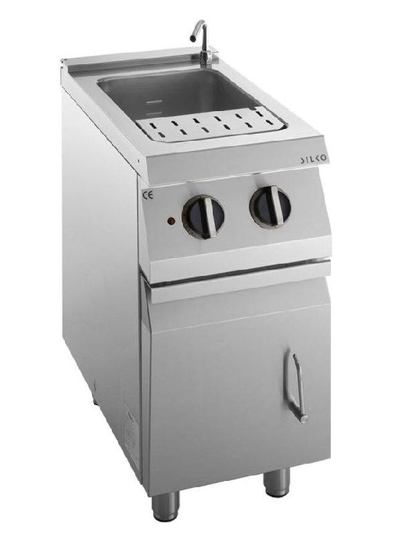 7178.0540 - Cuiseur a pates professionnel electrique 1 cuve 18l sur armoire férmée 9kW Dimensions (LxPxH) (mm) : 400x700x900 Tension (Volt) : 400 Puissance totale (kW) : 9 Plage de temperature (°C) : 0 - 120 Nombre de paniers : 3 Capacite (Ltr) : 1X 18