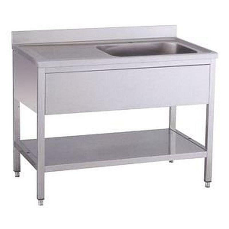 Table de chef fabriquée en acier au nickel - chrome 18/10 (AISI 304) avec fond de base et rebord. 1 bassin à gauche avec une taille de bassin L x P x H 400 x 400 x 200 mm. Construction d'huisserie en tube carré soudé 40 x 40 mm. Plan de travail avec débordement du plan de travail de 6 mm sur le