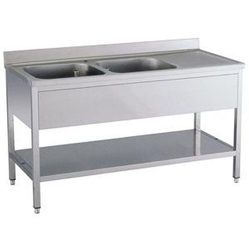 Plonge : - 2 bacs : 400x500x300 mm - 1 égouttoir à gauche - Matériau : inox - Modèle : adossée - Dimensions : 1600x700x900 mm - Équipée d'une étagère - Passage pour machine à laver -