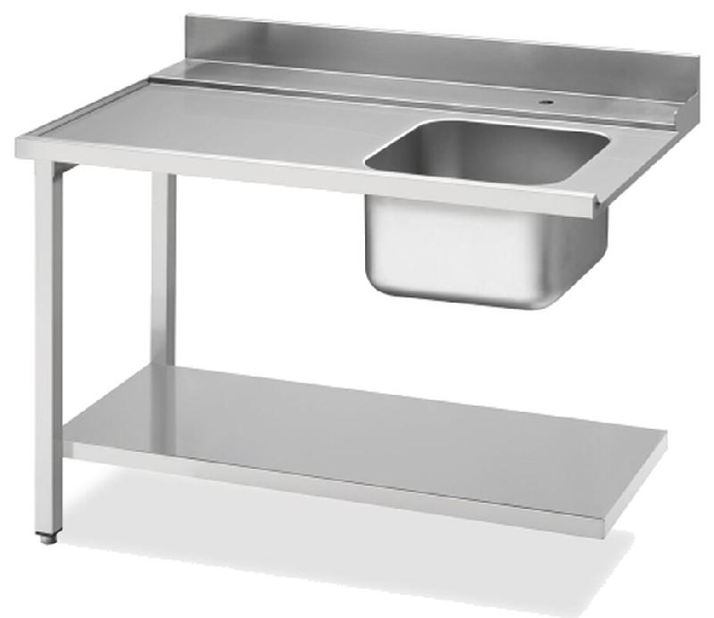 Table d'arrivée largeur 120cm pour lave-vaisselle à capot avec une voie de panier de 50cm. Entièrement en inox avec fond et rebord arrière d'une hauteur totale de 850 mm. Table d'arrivée avec cuve encastrée à droite, et montage à gauche sur le lave-vaisselle. Lors du montage, les inégalités du sol peuvent être compensées par le client grâce aux pieds à crampons encastrés dans la table d'arrivée.Détails du produit