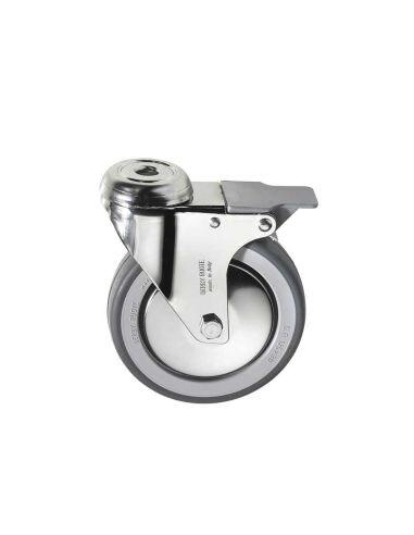 Roulette pivotante en acier inoxydable avec support à perçage pour boulons en tôle emboutie, dotée d#x27;une cage à billes à double rangée dans la tête pivotante (matériau n° 1.4301/AISI 304). - Roue avec bande de roulement en caoutchouc thermoplastique (TPR) gris, conducteur d#x27;élect