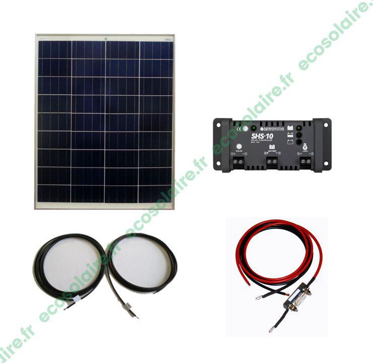 Ce kit comprend : - Le panneau solaire - Le régulateur - Tous les câblages nécessaires pour connecter jusqu'à la batterie - Important : La batterie n'est pas fournie. Nous vous conseillons une batterie de 75Ah en 12V minimum.