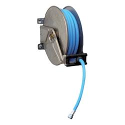 Enrouleur automatique inox livré avec tuyau de lavage bleu, qualité agroalimentaire de 10 ou 15 m en 1/2" débit maximal à 4 bars : 13 l/min pression maximum : 5 bars