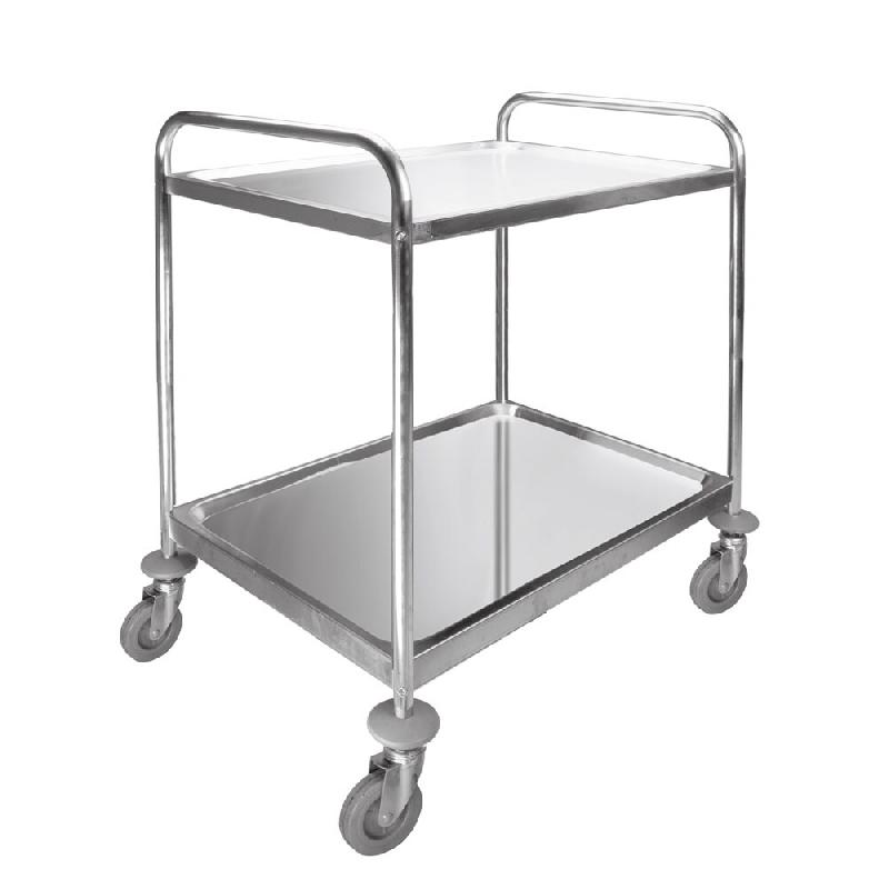 - Chariot de service polyvalent avec 2 plateaux amovibles, avec cadre en acier robuste pour un nettoyage facile, - Tube AISI 304, 25 mm de diamètre, - Dimensions du plateau : 928 x 678 x 0,9 mm, - Roues avec frein, - Larges poignées sur les côtés pour des manœuvres stables, - Supporte jusqu'à 100 kg en poids, - Montage facile.