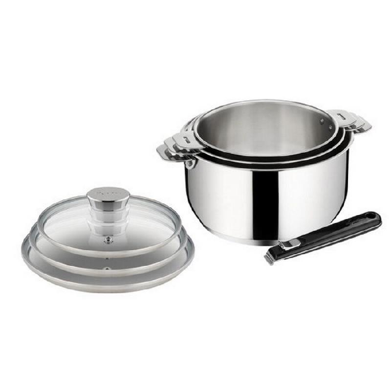 Série de 4 casseroles Plug & Play, de diamètres 14,16,18 et 20cm. - Livrées avec 1 poignée amovible en inox avec verrouillage sécurisée - Fond diffuseur capsulé en inox/aluminium thermo frappé à angle droit permettant une répartition homogène de la chaleur. - Grâce à ce fond, vous é