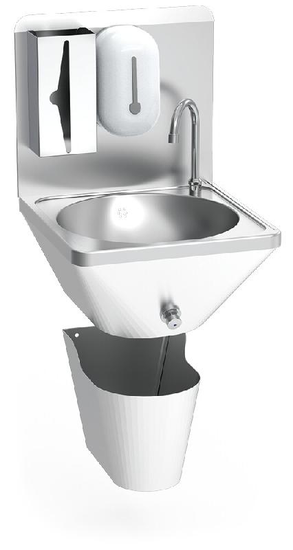 Lave - main inox - Commande par poussoir fémoral - Robinet col de cygne - Dosseret monobloc avec cuve emboutie - Mélangeur eau chaude / eau froide - Bonde et flexible - Distributeur de savon - Cuve ovale : 370 x 290 x 130 mm - Dimensions : 420 x 360 x 560 mm -