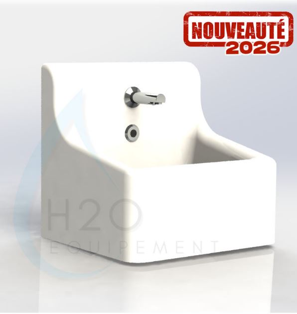 Lavabo en polyester armé fibre de verre et gelcoat de qualité sanitaire destiné au lavage hygiénique des mains. Dernier - né de la gamme, le lave - mains Gamme OCEA a été conçu suivant le même procédé et les mêmes matériaux que les lavabos de bloc opératoire. Son faible encombrement pe