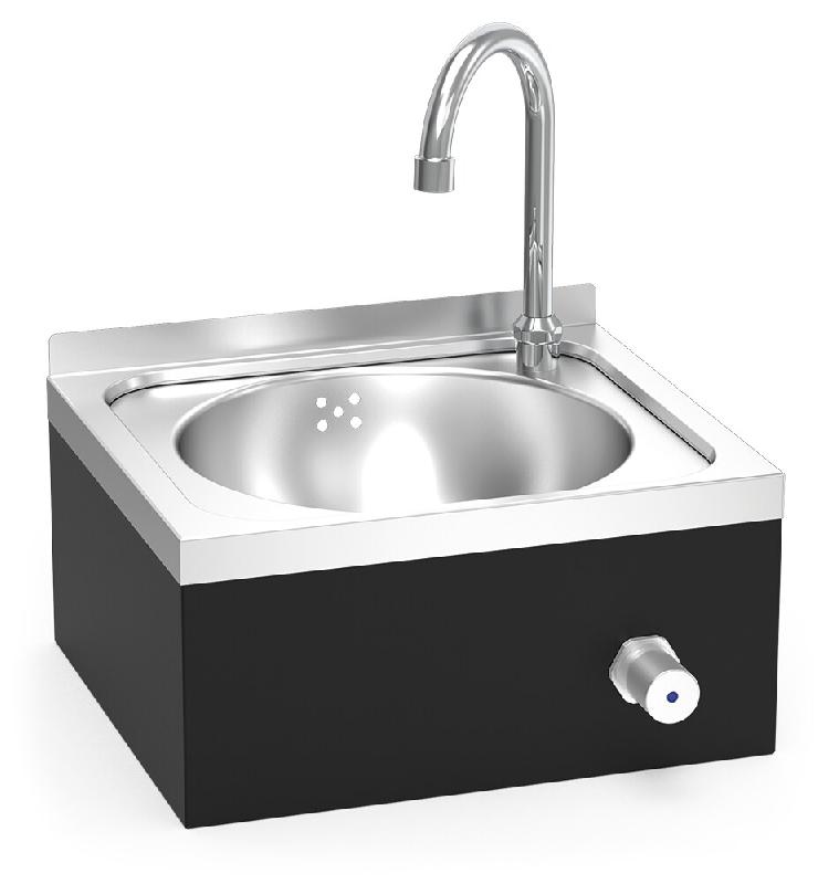 Lavabo mural avec système à genoux et finition noire, idéal pour les espaces où il est nécessaire de maintenir l'hygiène sans contact. Dimensions : 350x300x200 mm.
