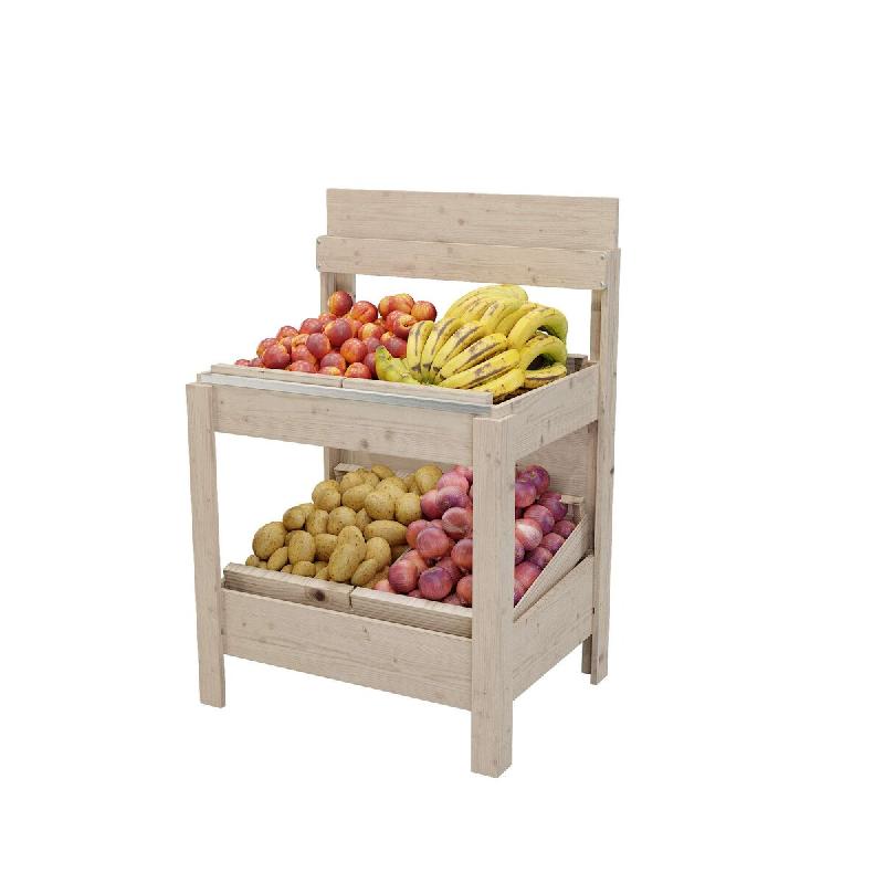 Présentoir fruits et légumes en bois massif sur 2 niveaux avec porte étiquette et fronton de communication intégrés - Idéal pour les petits espaces - Conçu pour une présentation en vrac et/ou en cagettes - Possibilité de rajouter une tablette en partie haute dans une configuration en î