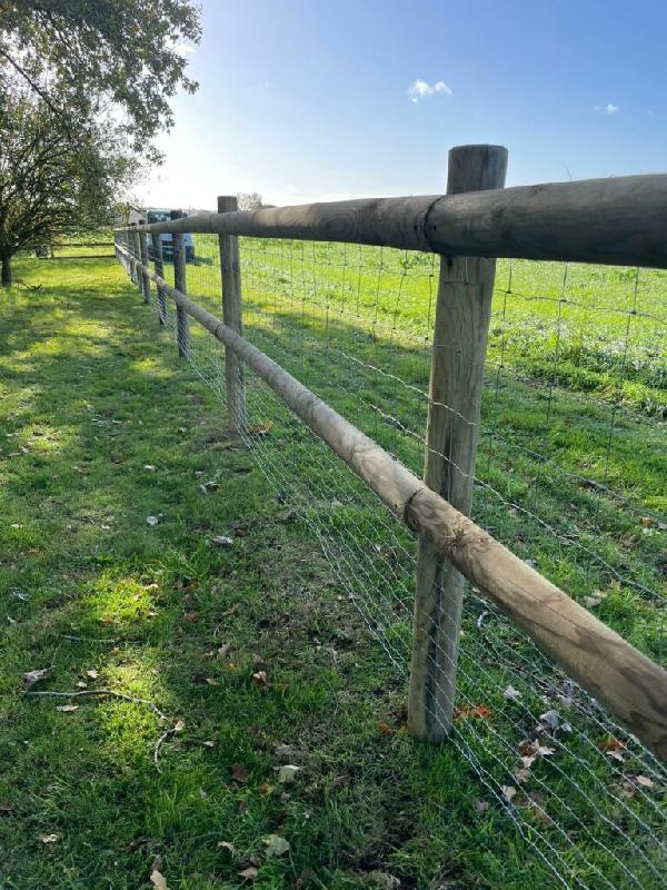 Clôture de carrière en bois traité autoclave classe 4, composée des éléments suivants : - Poteaux ronds appointés : hauteur de 2 m, diamètre de 120 mm. - 2 lices en demi - rond : longueur de 2,50 m, diamètre de 120 mm. -
