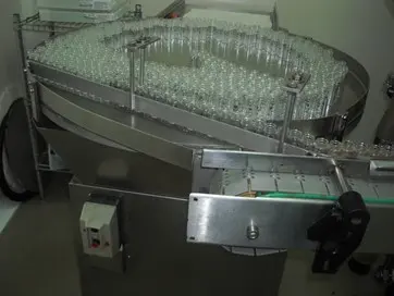 Ligne de conditionnement de flacons et bouteilles pour diamètres de 21 à 40 mm, fabriquée par HISPAMEC. Plaque d'alimentation et tapis roulant de 1000 mm de diamètre. Remplissage de produits liquides et visqueux. Production entre 500 et 2000 unités/h selon volumes et type de produit. Contient 2 alimentateurs vibrants pour bouchon en caoutchouc et capsules en aluminium.