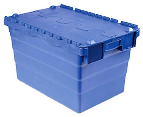 Bac avec couvercle intégré bleu type bac crocodile - Emboitables lorsque le couvercle est ouvert - Empilables lorsque le couvercle est fermé - Options : bac sans couvercle, plombs de scellé, pochette autocollante, barres de gerbages, roues pivotantes, semelle inférieures. - Avec couvercle