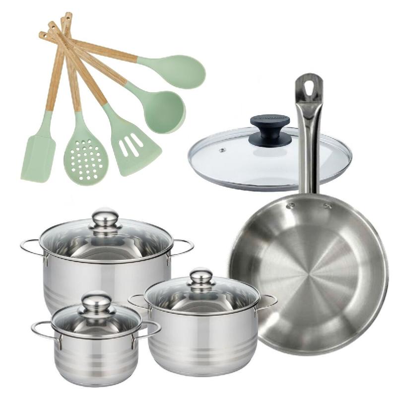 - COMPOSITION : Faitouts en acier inoxydable, poêle en inox, ustensiles en silicone et bois, tous conçus pour une utilisation quotidienne.