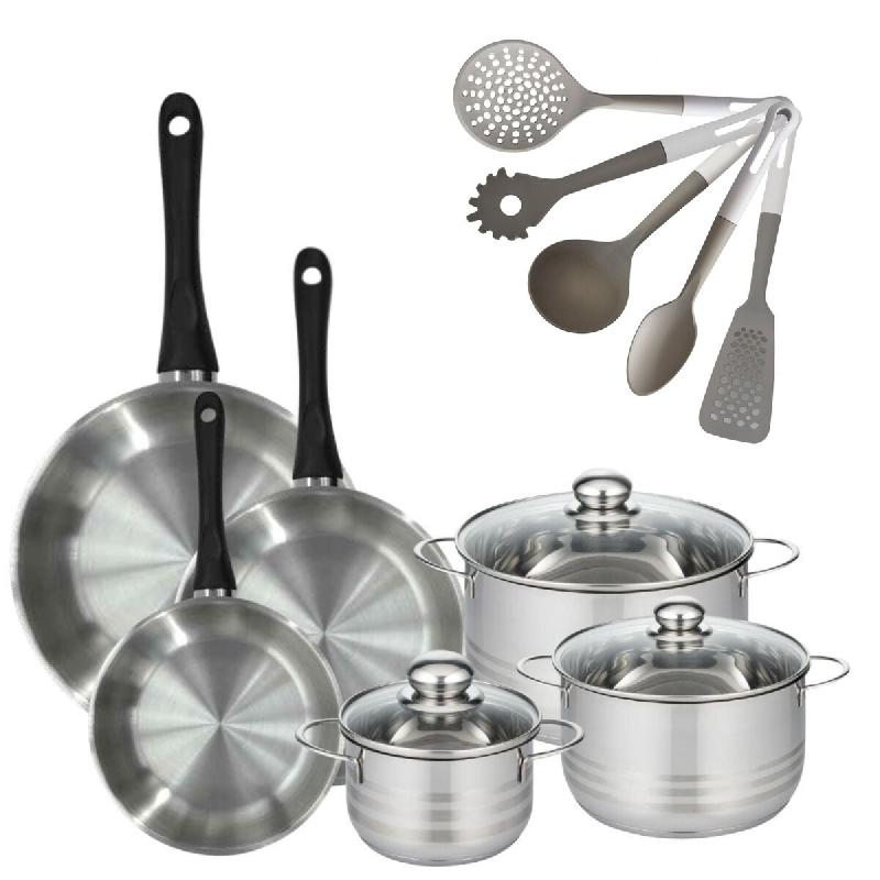 Lot 3 Poêles Inox 20/24/28cm Fackelmann Geneva & 3 Faitouts 16/20/24cm avec 5 Ustensiles Fackelmann - 3176239921946