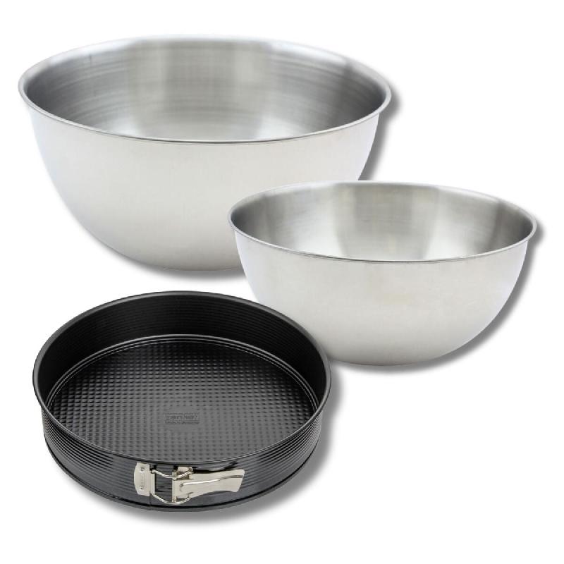 Cet ensemble d'ustensiles de pâtisserie inclut un moule à manqué à charnière de 26,3 cm de Zenker, parfait pour la cuisson de gâteaux et cheesecakes. Sa conception en acier étamé assure une cuisson uniforme et un démoulage facile. Les bols à mixer Fackelmann, de 25 cm et 20,5 cm, en acier