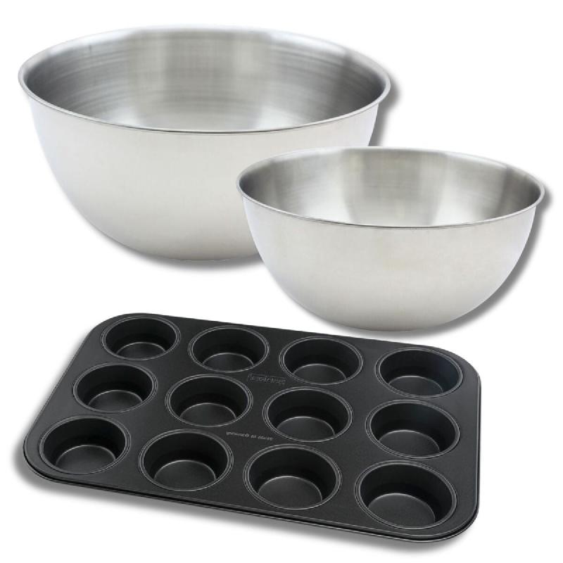 Lot comprenant 1 Moule à Muffins 12 empreintes, 1 spatule Zenker et 2 bols à mixer en inox Fackelmann - noir métal 3176239936469