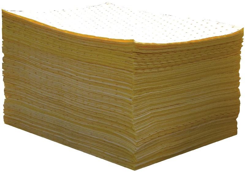 Réf. PC 100 - J : Feuilles absorbantes en fibre de polypropylène double épaisseur, pré - découpées, anti - peluches.Caractéristiques principales : - Fort pouvoir d'absorption des fuites de tout type de liquides industriels, en particulier des produits chimiques (acides, solvants et autres ba