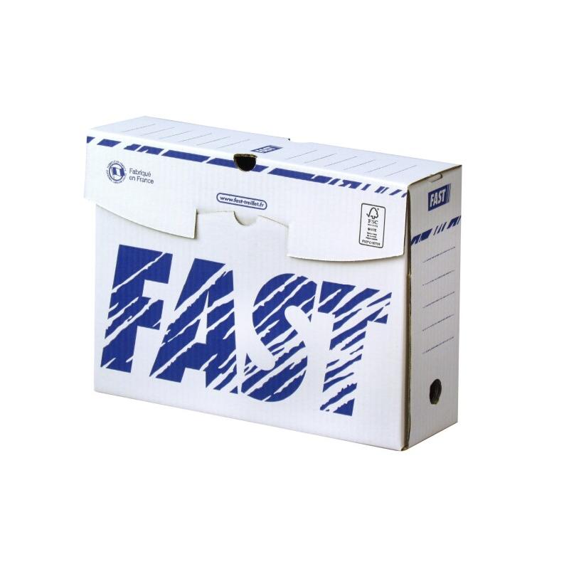 Boîte d'archives Standard Fast format 25x33 cm, dos 20 cm, en carton blanc robuste avec impression bleue. Idéales pour documents A4+, ces boîtes Made in France certifiées FSC offrent un archivage professionnel avec zones d'indexation sur 5 faces. Montage facile, empilables et 100% recyclables.