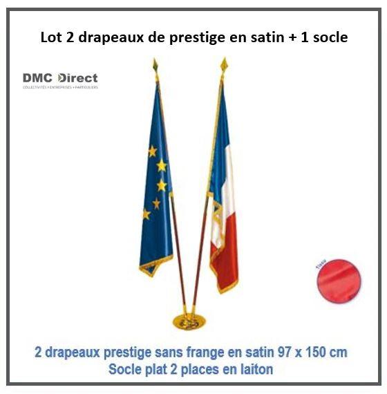 Lot de 2 drapeaux de prestige en satin 97 x 150 cm - France et Europe - Hampe démontable et socle laiton