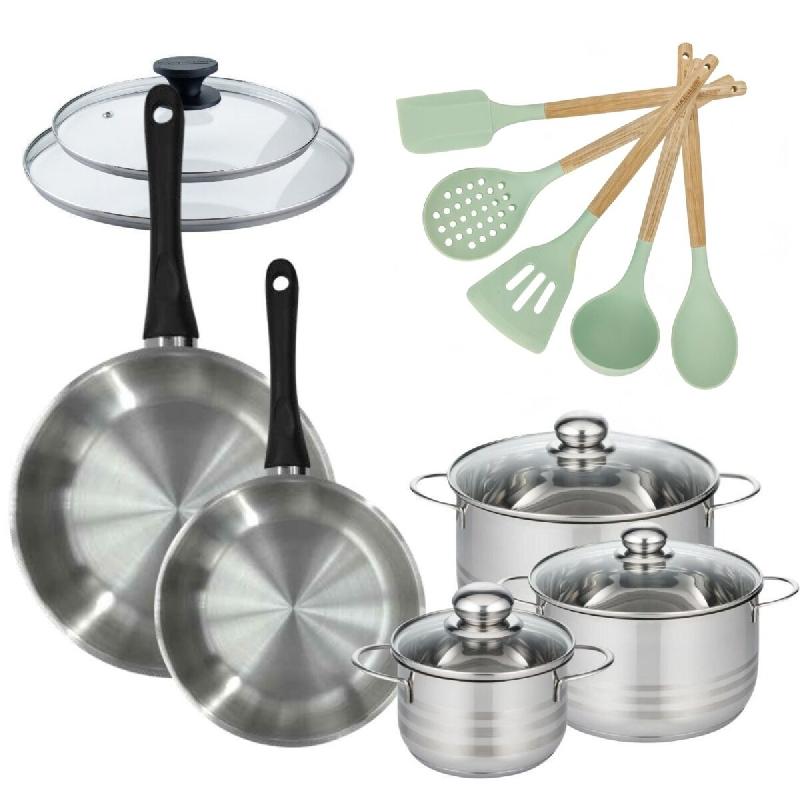 - COMPOSITION : Faitouts et poêles en acier inoxydable, ustensiles en silicone et bois, couvercles en verre résistant avec rebord inox.