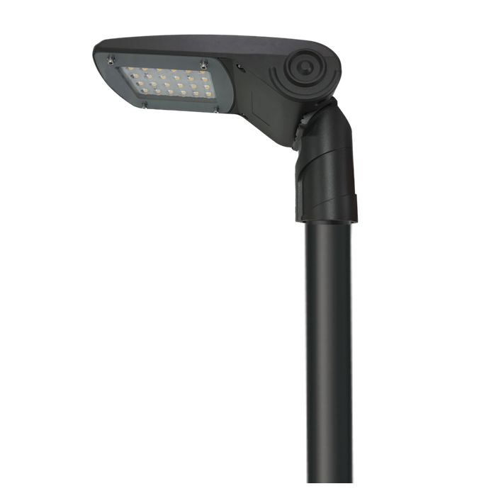 Ce luminaire sur mât design est étanche IP66 et peut s'incliner jusqu'à 15°.
