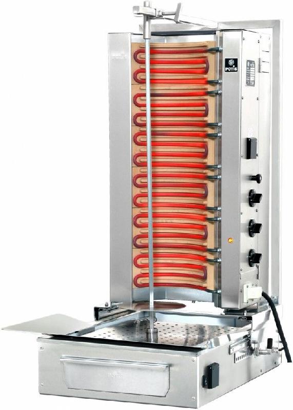 Le grill Potis Doner Gyros possède un moteur en bas et un bac à graisse fixe intégré à sa structure. Ses éléments chauffants sont dotés de pierres céramiques. Ces éléments, ainsi que leur boîtier, peuvent être avancés pour les rapprocher de la viande, ce qui est très pratique lorsque celle-ci réduit de volume à la broche.