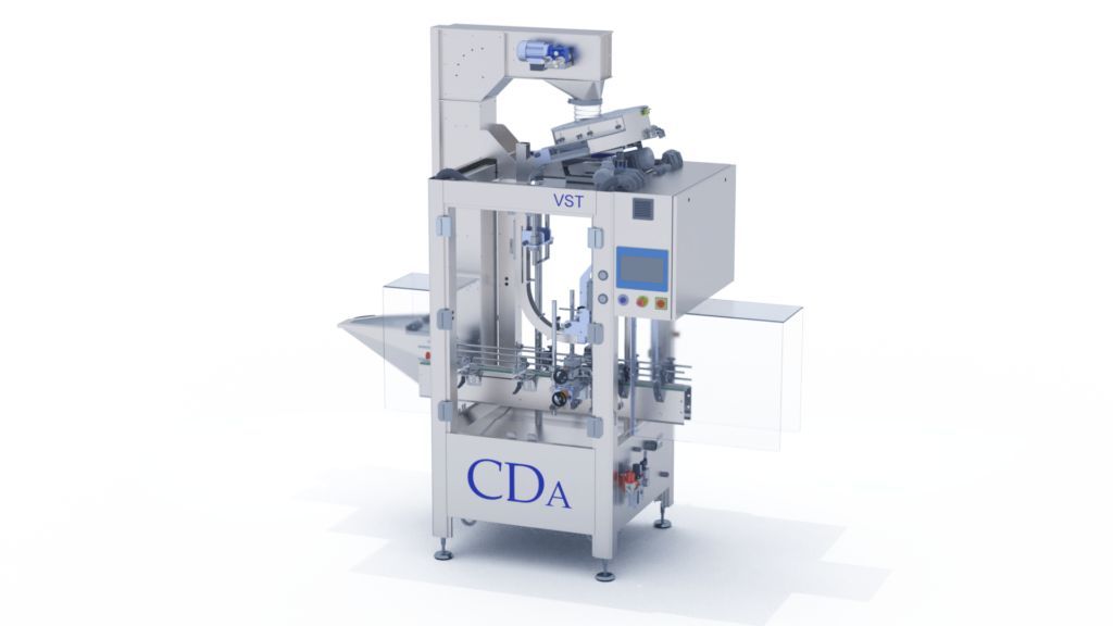 La VST, développée par CDA, est un module automatique de distribution et d'enfonçage de bouchons à tête, offrant une solution linéaire tout inox. Cette machine assure la distribution automatique des bouchons en T sur les bouteilles avant de les enfoncer, atteignant une cadence pouvant aller jusqu'à 1800 bouchons/heure (selon le type de bouchon, etc.).