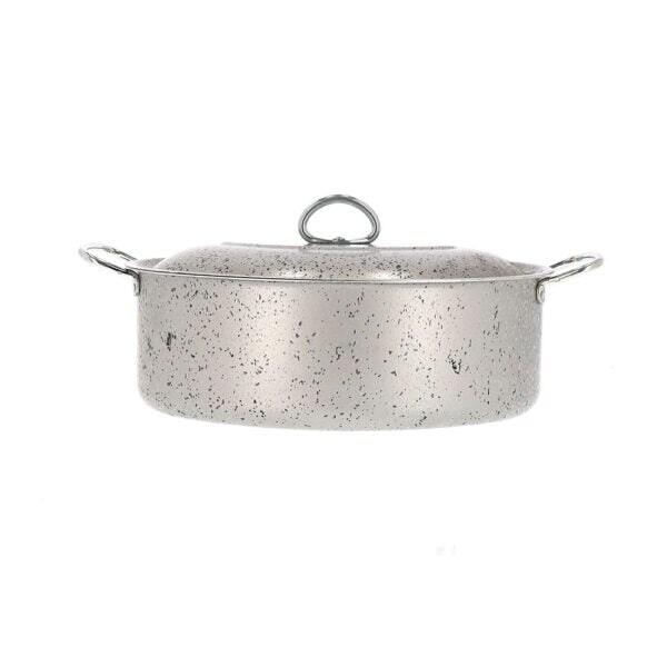 Plat à rôtir en aluminium fabriqué en Italie, conçu pour la cuisson de plats principaux de viande ou de poisson, aussi bien sur la plaque de cuisson qu'au four. Doté d'un revêtement antiadhésif « Seven Stone » à 7 couches, résistant aux rayures, sa surface permet de détacher facilement l