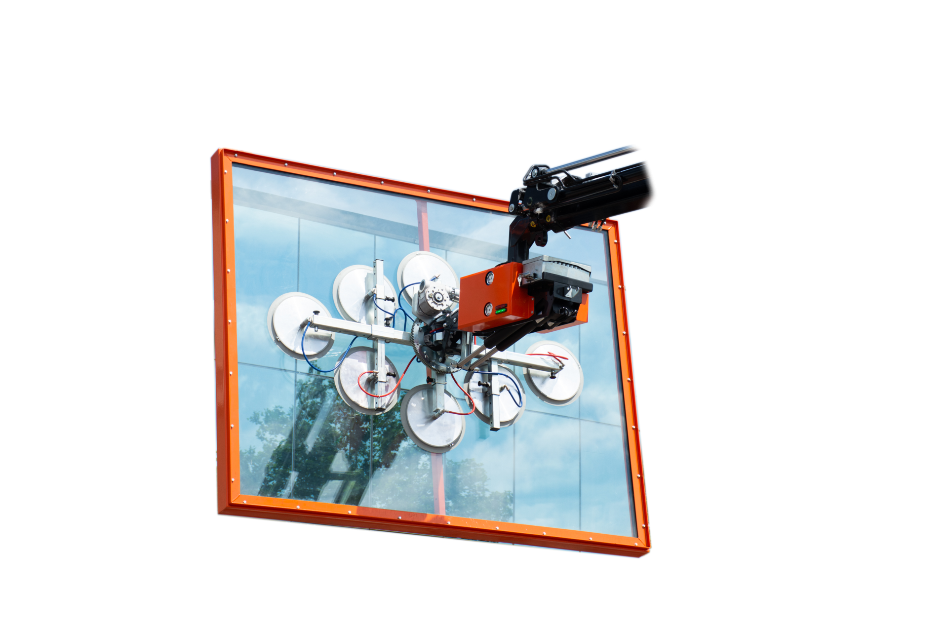 Manipulateur de verre universel et pour surfaces non poreuses. Convient à n'importe quelle grue. Avec télécommande radio indépendante et plateau de transport.
