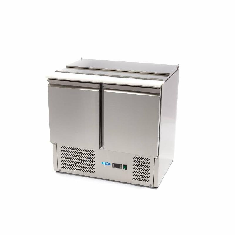 P>Une saladette professionnelle est utile dans toute cuisine de restauration, surtout si vous devez souvent préparer des salades et des sandwiches. Cette saladette de 90 cm de long est équipée de deux portes de placard en acier inoxydable et d'une planche à découper en plastique, utile pour cou