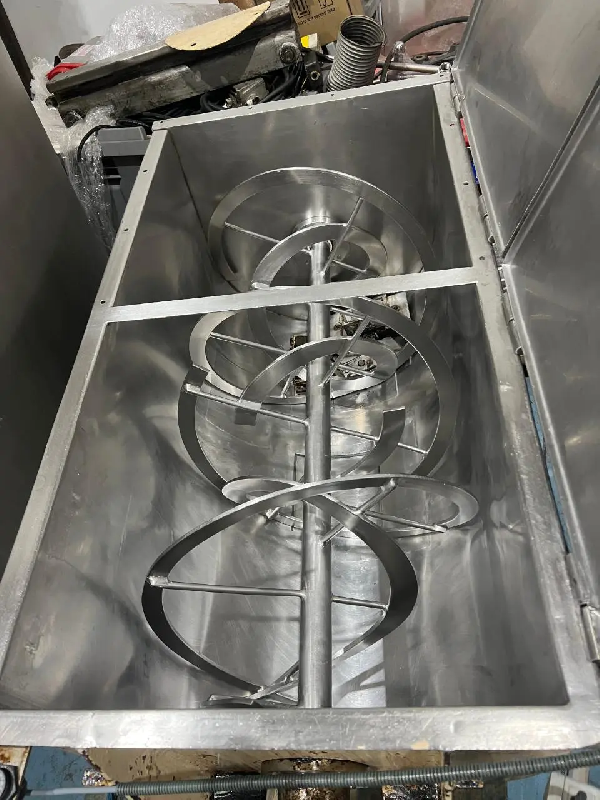 Mélangeur à bande d'occasion en acier inoxydable d'un volume total de 200 litres Dimensions intérieures : Longueur : 1000 mm Largeur : 500 mm Hauteur : 340 mm.